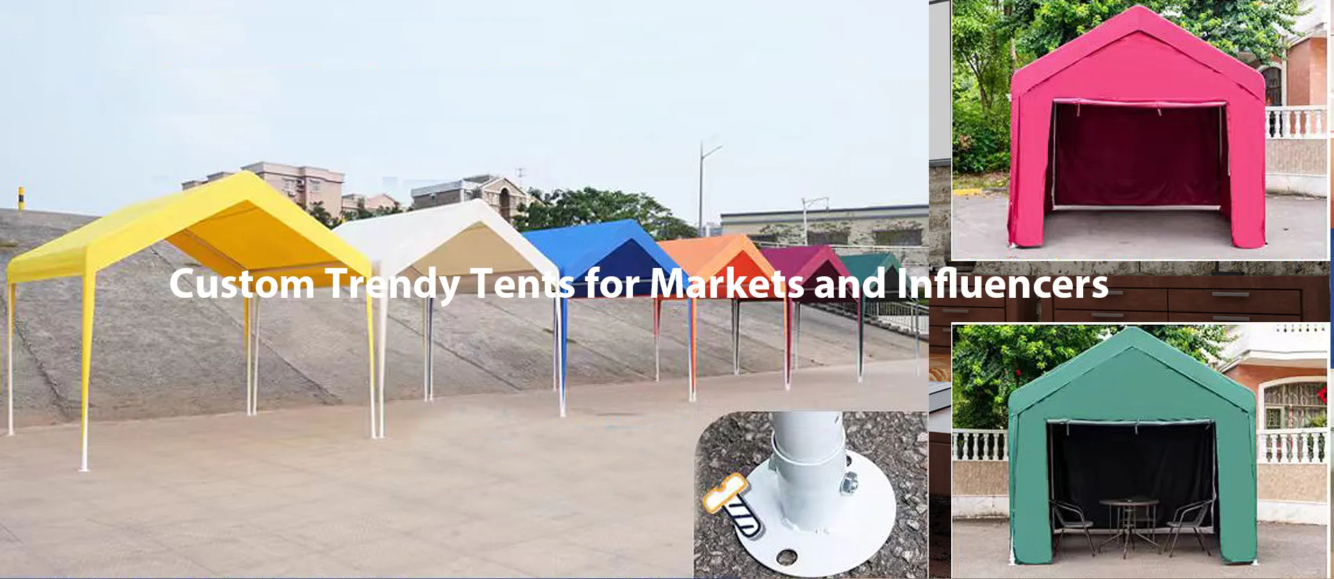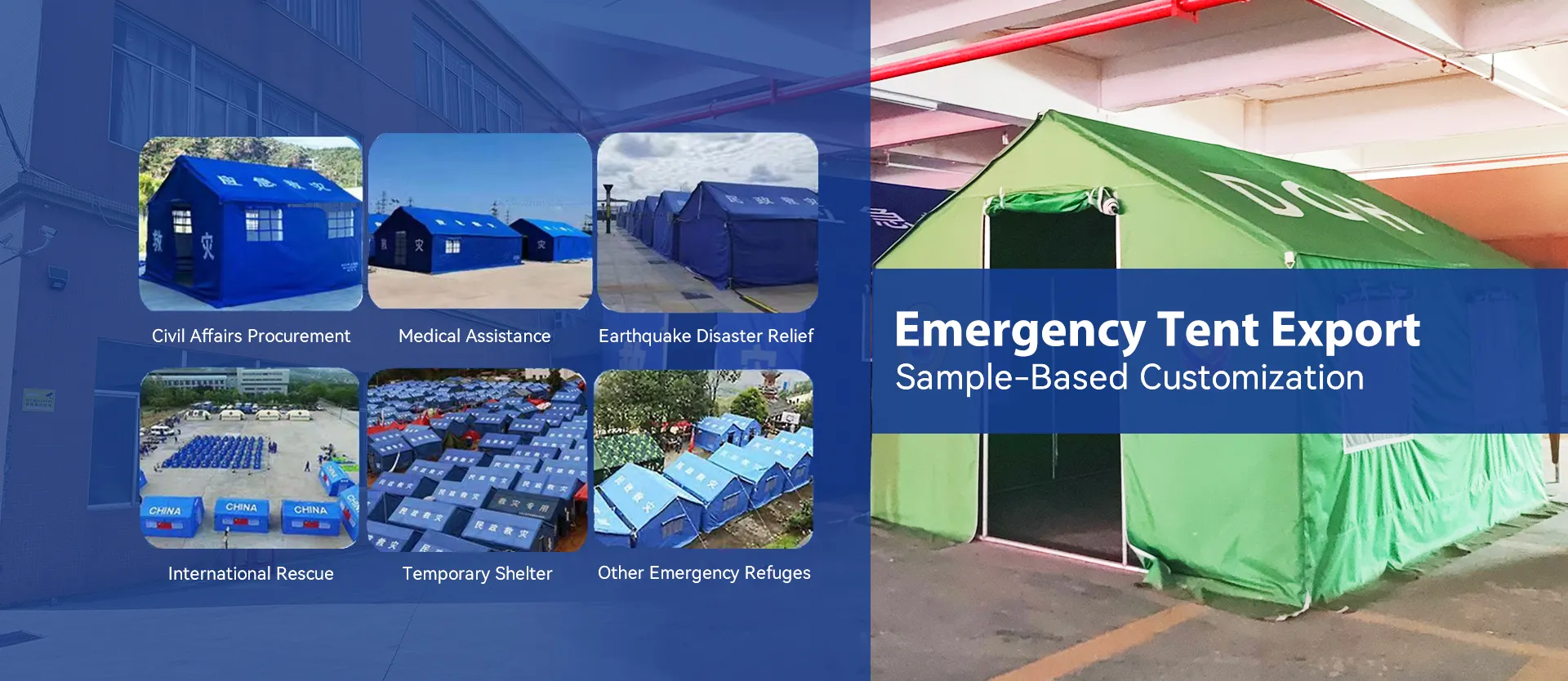 We provide customized tents: pop-up, emergency, umbrella, and industrial